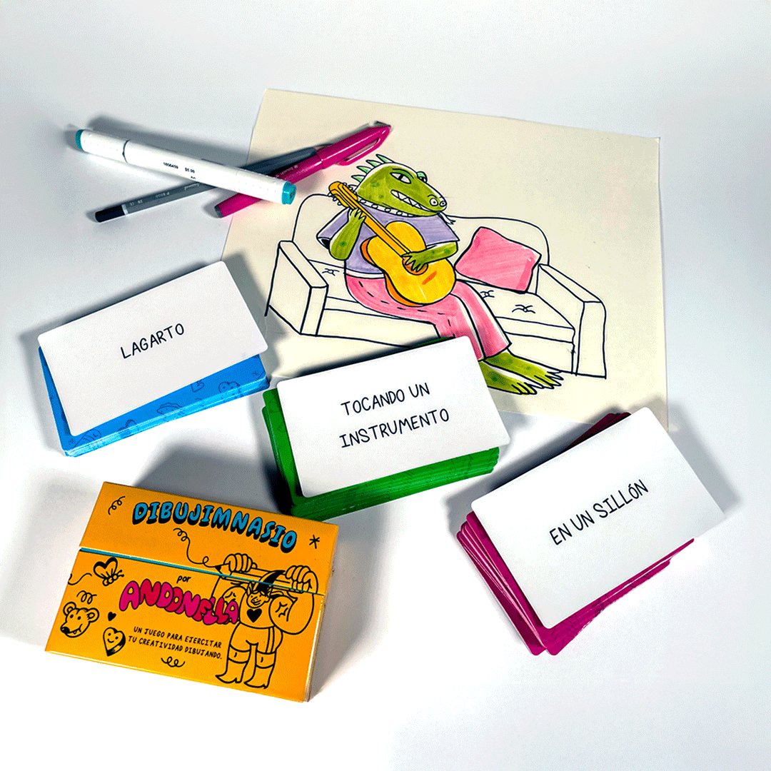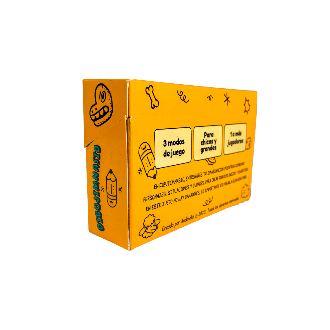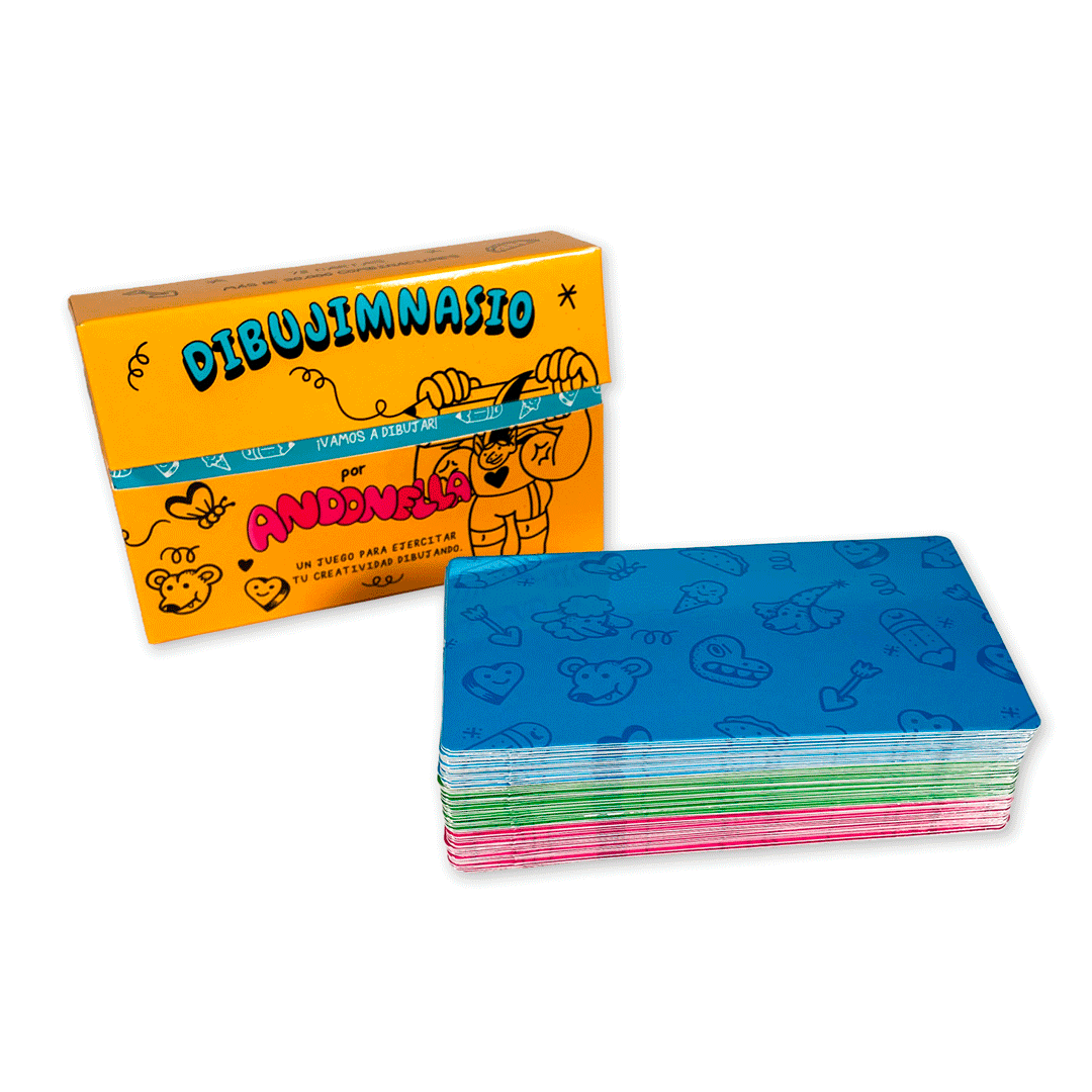 Dibujimnasio es un juego de cartas para ejercitar tu creatividad dibujando. Contenido: 72 cartas en total. 24 cartas color azul con diferentes personajes. 24 cartas color verde con algunas acciones. 24 cartas color rojo con ejemplos de espacios o lugares. Más de 3 modos de juegos. Uno o más jugadores. Para mayores de 6 años.
