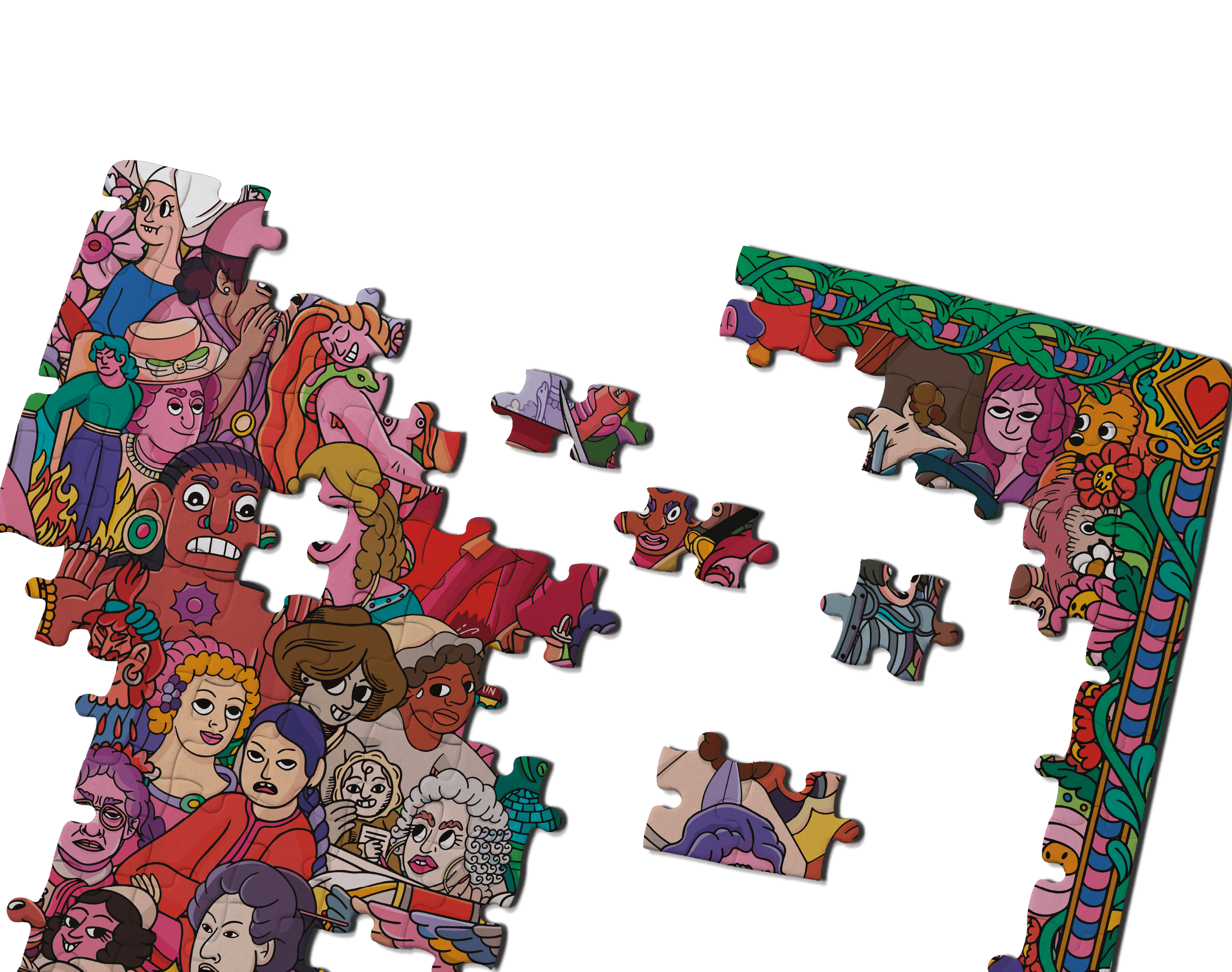 Este rompecabezas incluye piezas de cartón rígido con acabado gofrado, un póster con la obra completa y una tarjeta de identificación con los nombres de todas las ídolas representadas. De esta manera, no solo armas una imagen ilustrada, también aprendes a reconocer a cada mujer y puedes seguir investigando sobre su historia.